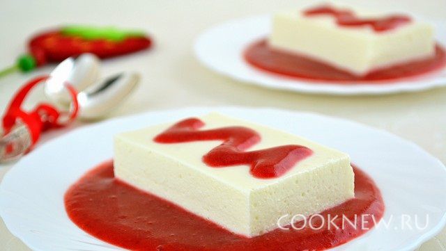 Очень вкусный нежный творожный десерт с ярким клубничным соусом. Рекомендуется мспользовать однородный творог,а не зернистый.
