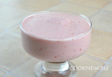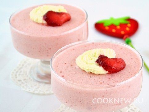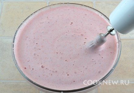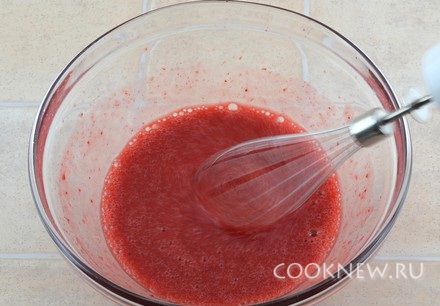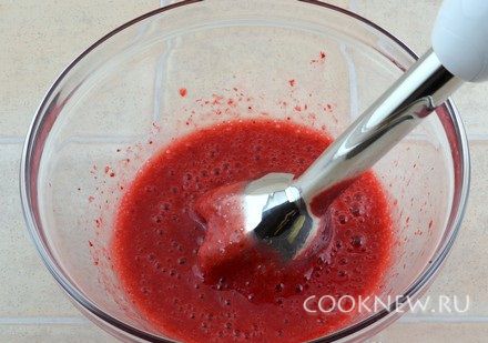 Клубнику измельчить блендером (одну ягоду можно оставить для украшения). По желанию, можно смесь протереть через сито, чтобы избавится от мелких косточек