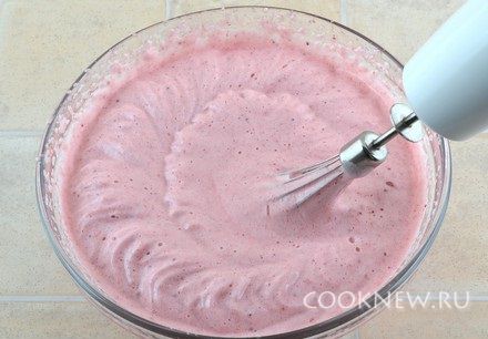 Яйца тщательно помыть горячей водой с мылом, вытереть. Отделить белки от желтков. Белки добавить к клубничной массе, взбить миксером не менее 5 минут, до момента, когда масса значительно побелеет и увеличится в размере в два-три раза.