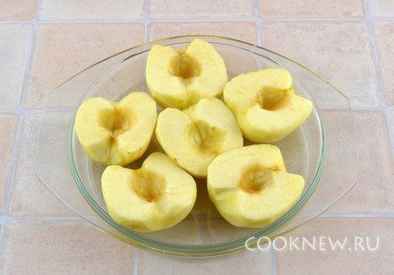Яблоки очистить от кожуры, разрезать пополам и вырезать несъедобную сердцевину. Положить в форму (или просто на противень)
