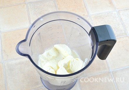 Добавить мороженое, порезанное крупными частями (без вафельного стаканчика). Влить молоко.