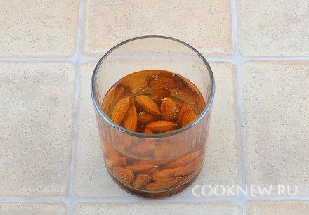 Миндаль залить кипятком, оставить на 5-10 минут, затем снять шкурку (она снимается очень легко). Как вариант можно залить водой комнатной температуры и оставить на несколько часов на ночь, затем также снять шкурку