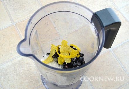 Смородину, не размораживая, положить в стационарный блендер. Туда же добавить сахар и лимонную цедру