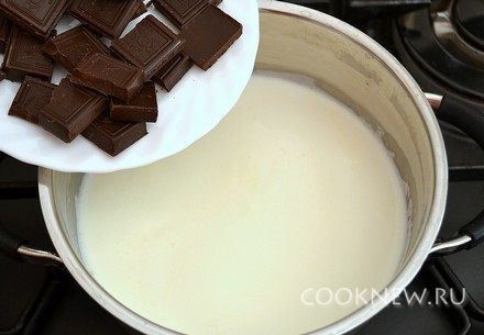 Остальное молоко и сливки налить в кастрюлю с толстым дном, добавить шоколад