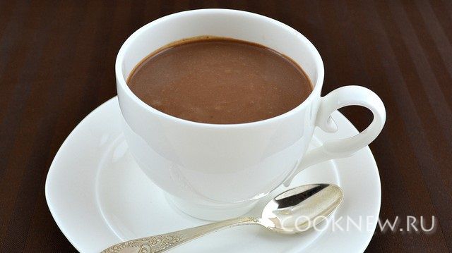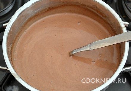 Нагревать, постоянно помешивая, пока весь шоколад хорошо не расплавится, и смесь станет однородной. Затем довести почти до кипения, влить разведенный крахмал, перемешать, выключить огонь.