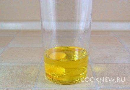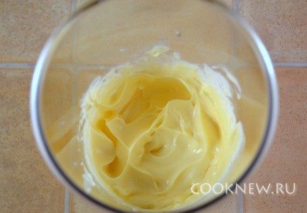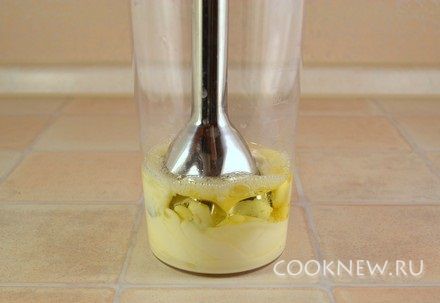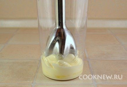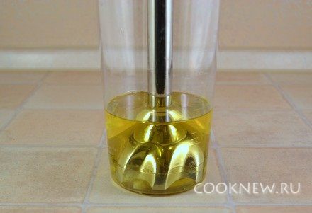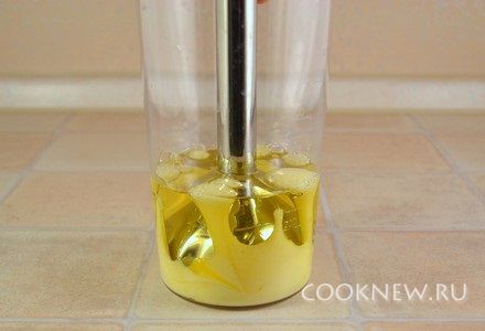 Вставить ножку блендера в емкость, накрыв желток