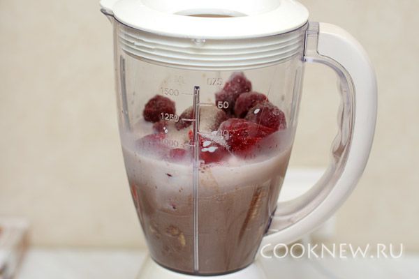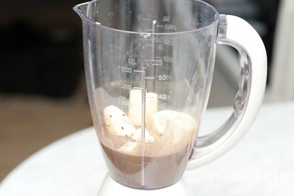 Какао остудить и перелить в блендер. Банан очистить, крупно порубить и добавить в блендер