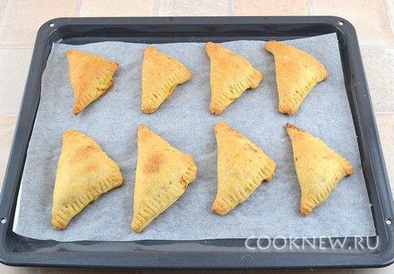 Положить заготовки на противень, застеленный пекарской бумагой. Поставить в разогретую до 180 градусов духовку. Выпекать примерно 30 минут