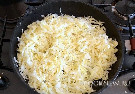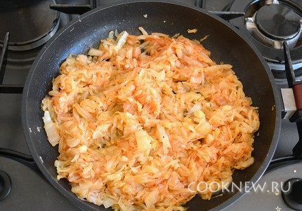 На сковороду налить растительное масло. Выложить капусту, жарить 20-30 минут до мягкости