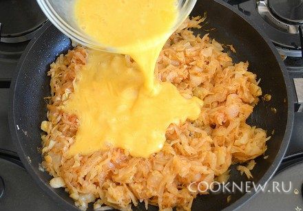 Яйца слегка взбить вилкой, влить к капусте.
