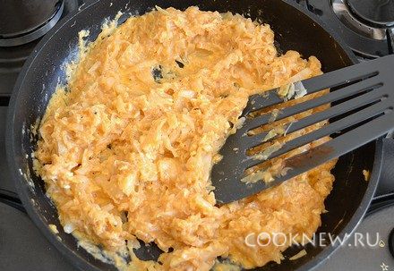 Перемешать, готовить в течение пары минут, до момента, когда яйца схватятся. Начинка готова