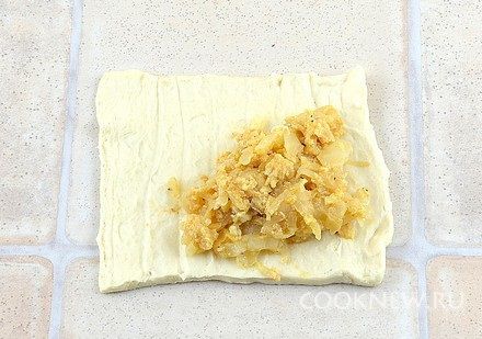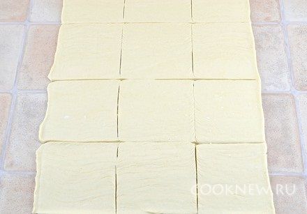 Тесто немного раскатать до толщины 3-4 мм. Порезать на квадраты примерно 8 х 8 см
