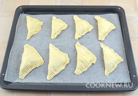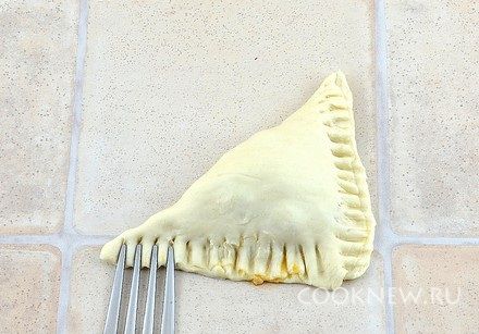 Завернуть в виде треугольного пирожка, придавить по краю вилкой. Если тесто прилипает, то обмакивать вилку в муку.