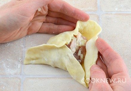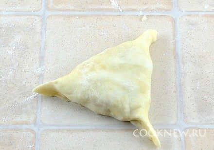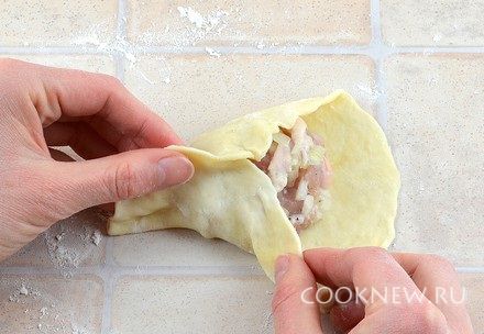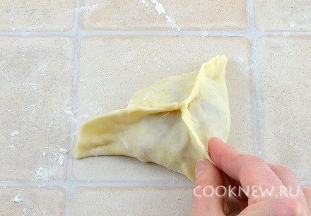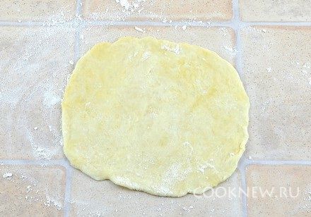 Каждый кусочек теста размять руками. Затем раскатать в тонкий круг диаметром примерно 12 см (при необходимости подсыпать муку)
