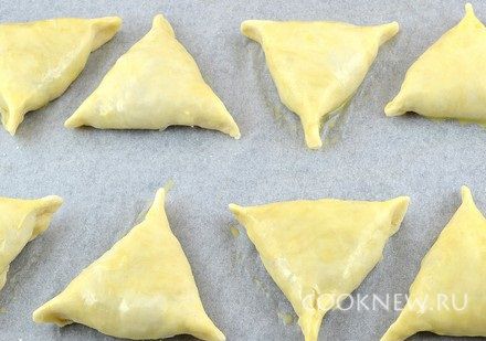 Полученные заготовки выложить на противень, застеленный пекарской бумагой. К желтку добавить ложку воды, взболтать. Смазать заготовки.