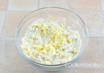 Готовим тесто. В емкость положить муку и 1/3 ч.л. соли. Туда же натереть на крупной терке масло (из холодильника). Периодически перемешивать его с мукой, чтобы кусочки не слипались