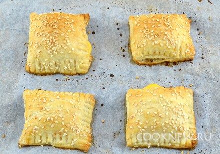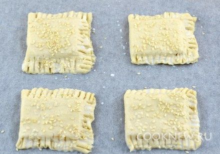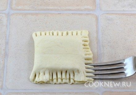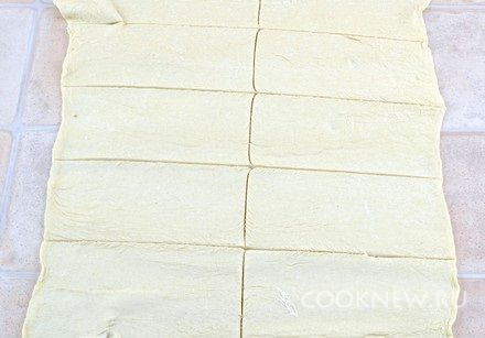 Тесто разморозить, раскатать в тонкий пласт (2-3 мм). Раскатывать в одном направлении. Порезать на прямоугольники 12 х 6 см