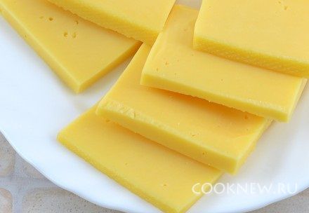 Сыр порезать на квадраты толщиной 5 мм со стороной 4-5 см