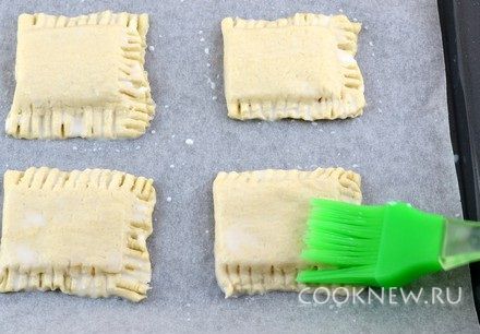 Заготовки положить на противень, застеленный пекарской бумагой. Немного смазать молоком