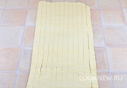 Тесто разморозить, немного раскатать в длину, до толщины 4-5 мм. Порезать полосками шириной примерно 1,5-2 см