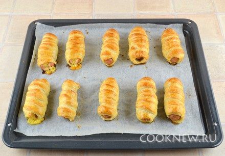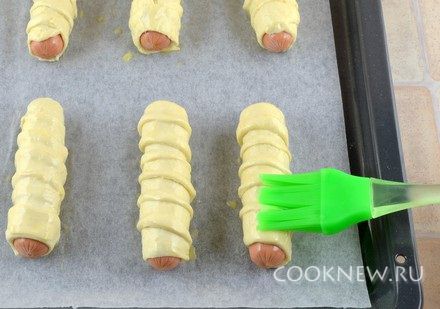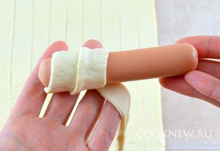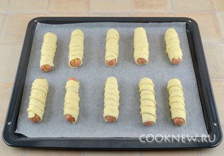 Сосиски очистить от оболочек. Завернуть сосиску в полоску теста по спирали и слегка внахлест (края сосиски должны слегка выглядывать).
