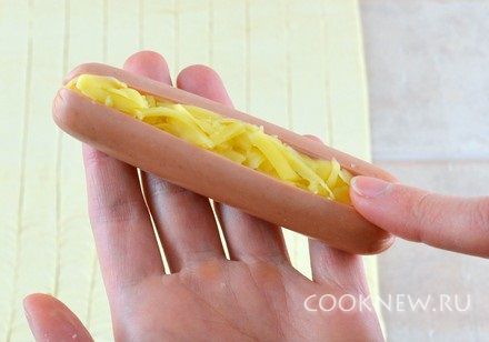 Можно по желанию использовать сыр. Сделать в сосиске небольшой надрез по длине, внутрь вложить немного натертого на крупной терке сыра
