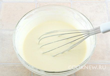 Добавить яйцо, молоко, сахар, ванильный сахар, соль, перемешать. Затем добавить разрыхлитель и муку, хорошо перемешать венчиком, чтобы не было комочков. Тесто получается по густоте примерно как для оладий