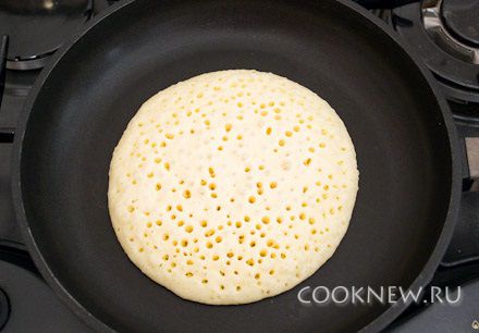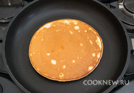 Сковороду разогреть, на сухую поверхность налить несколько столовых ложек теста, оно плавно растечется в толстый круг. Накрыть крышкой, жарить на огне чуть меньше среднего примерно 3-4 минуты или до появления характерных пузырьков. Жарить на сухой сковороде можно только если она имеет антипригарное покрытие, если у вас сковорода другая, то лучше предварительно ее немного смазать сливочным или растительным маслом. Также можно жарить не в виде одного большого панкейка, а в виде 3-4 небольших (по принципу оладий).