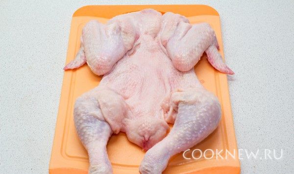 Для начала необходимо снять с курицы кожу. Начинаем с ног, отрезали голени и попку. И по грудке обдираем кожу. Потом отрезаем крылья
