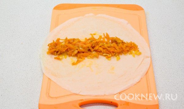 Морковку обжарить с луком, на оливковом масле. Разделить пополам и завернуть в два готовых блина