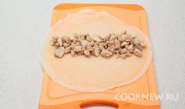 Обрезаем куриную грудку и разрезаем на полоски. Заливаем 2 столовыми ложками соевого соуса и оставляем мариновать на 15-20 минут. Курицу обжариваем на сковороде 5 минут. И заворачиваем в три блина
