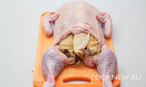 И начиняем нашу шкуру. Для того чтобы все соки не вытекали шкуру нужно зашить снизу. Шкурку надо проколоть зубочисткой в нескольких местах, чтобы она не лопнула и отправляем в духовку на 30-40 минут