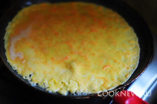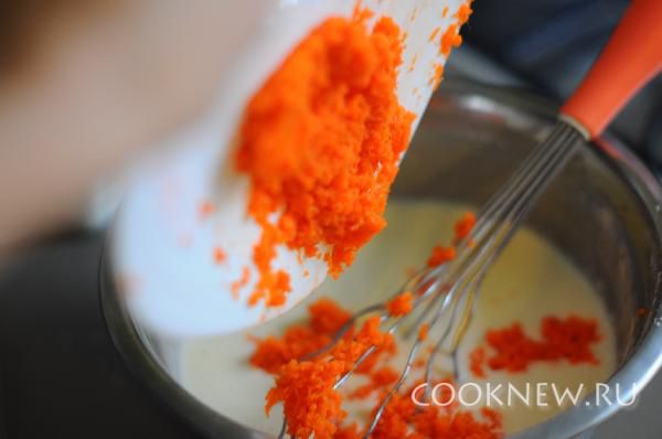 Натереть морковь на самой мелкой терке и добавить в блинную смесь