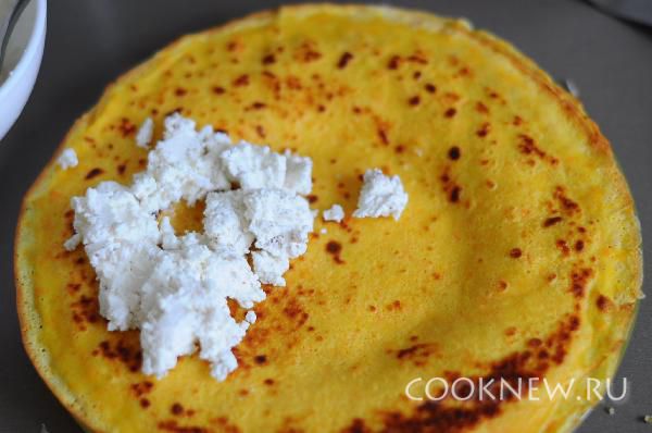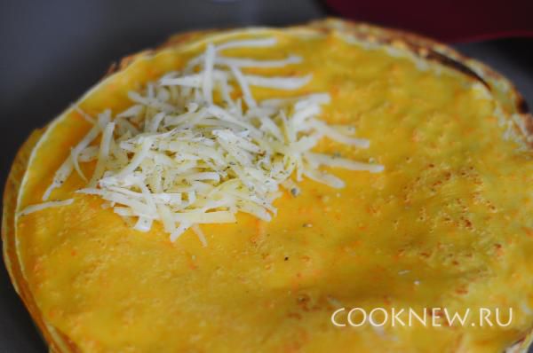 На половину блинчиков положить начинку из тертого сыра, на четвертую часть блина, чтобы можно было свернуть в конвертик