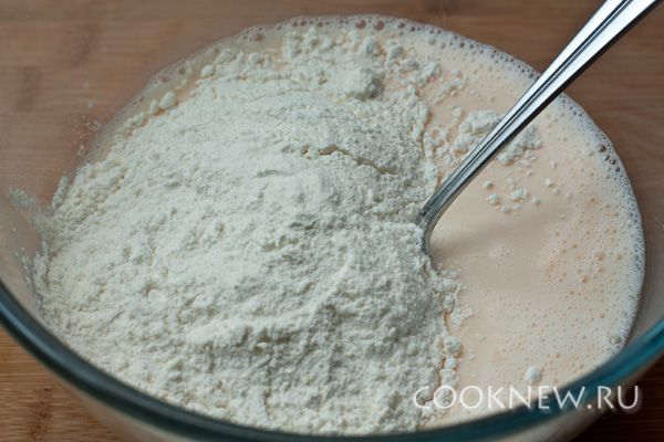 Просейте в миску муку, тщательно перемешайте, чтобы не было комков