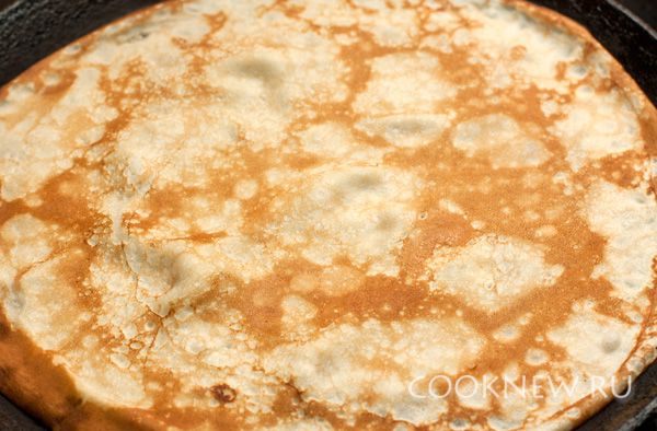 Разогрейте сковороду на среднем огне, слегка смажьте маслом для первого блина. Наливайте тесто на сковороду тонким слоем, наклоняя ее в разные стороны, чтобы тесто равномерно распределилось. Жарьте с обеих сторон до румяного, золотисто-коричневого цвета