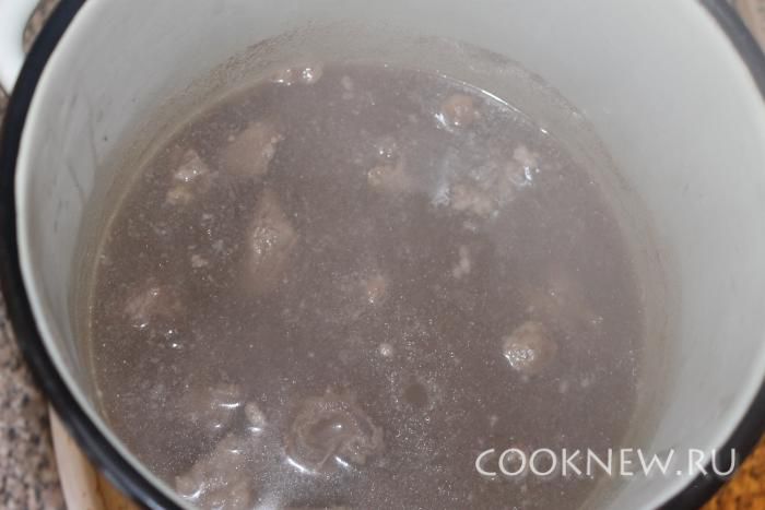 Сначала сварим бульон. Для этого зальем мясо кипятком, доведем до кипения и варим, пока мясо не станет мягким.( 2 часа.) Для лучшего вкуса можно положить в бульон целую луковицу и проварить ее. Потом луковицу нужно вынуть.