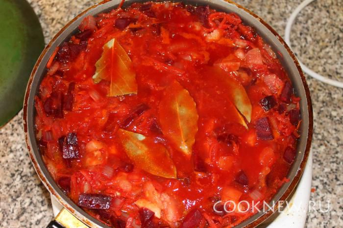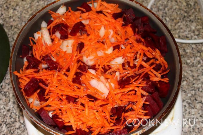 Пока варится бульон мы готовим зажарку. Обжариваем в масле натертую свеклу, морковь и лук кубиками. Немного протушим, добавим чуть чуть воды и 2-3 ст. ложки томатной пасты.