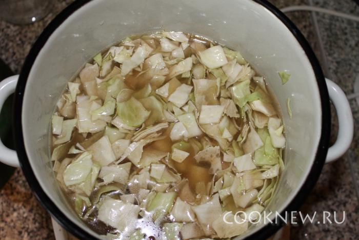 Когда бульон готов, достаем луковицу, отделяем мясо от кости и нарезаем на кусочки, и обратно в бульон. Следом опускаем картофель, нарезанный крупными кубиками и квашенную капусту. Все варим на медленном огне.