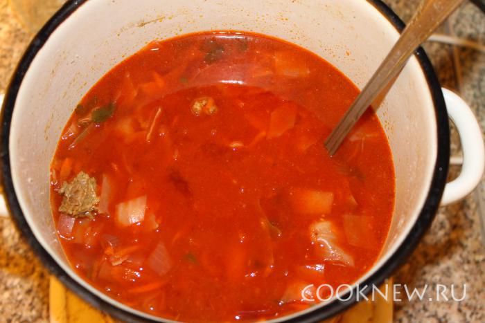 Через 10 минут добавляем всю зажарку и солим по вкусу почти готовый борщик. Выключаем кастрюльку, но не снимаем с огня. Кладем мелко нарезанную зелень.
