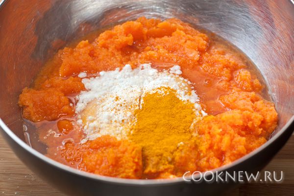 Подготовленную мякоть превратите в пюре с помощью блендера, затем добавьте молоко, яйца, соль и куркуму. Эта специя не только подчеркивает яркий цвет оладий, но и улучшает вкус и аромат. Все перемешайте