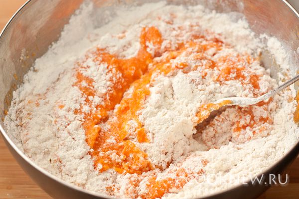 Просейте в тесто муку. Количество муки может варьироваться в зависимости от характеристик тыквы, размера яиц и влажности самой муки. Тесто должно быть довольно густым