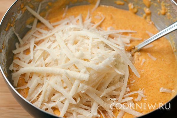 Сыр натрите на крупной терке, всыпьте в тесто и хорошо все перемешайте