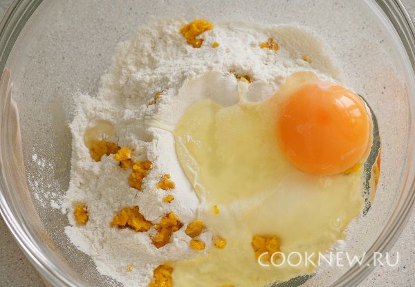 Соединяем в чашке муку, сахарную пудру (25 гр) и цедру апельсина. В середину смеси разбиваем яйцо