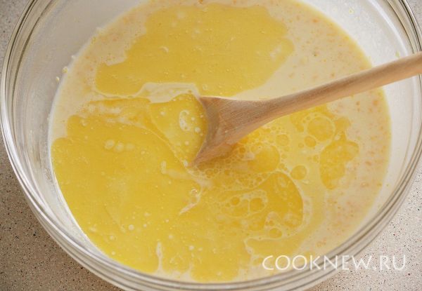 Начинаем замешивать тесто, постепенно вливая половину молока. Размешиваем до полного исчезновения комочков. Затем вливаем оставшееся молоко и растопленное сливочное масло (25 гр)