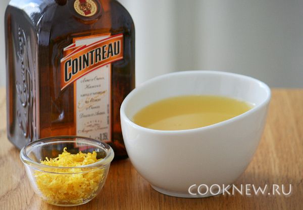 Для приготовления соуса смешиваем апельсиновый и лимонный соки, лимонную цедру и ликёр