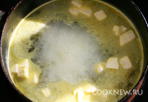 Выливаем смесь в холодную сковородку, добавляем сахарную пудру (75 гр) и, помешивая, нагреваем на медленном огне до растворения пудры. Огонь немного прибавляем и кипятим при небольшом побулькивании 2-3 минуты. Затем добавляем сливочное масло, порезанное небольшими кубиками. Мешаем до полного растворения масла и варим ещё 3-4 минуты при небольшом кипении