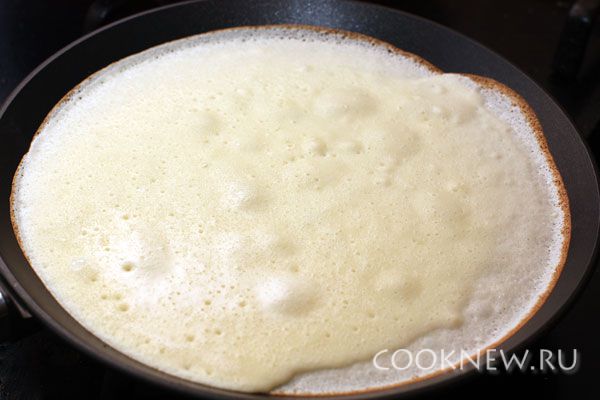 Жарьте тонкие блинчики с одной стороны без масла и складывайте в стопку поджаренной стороной вверх
