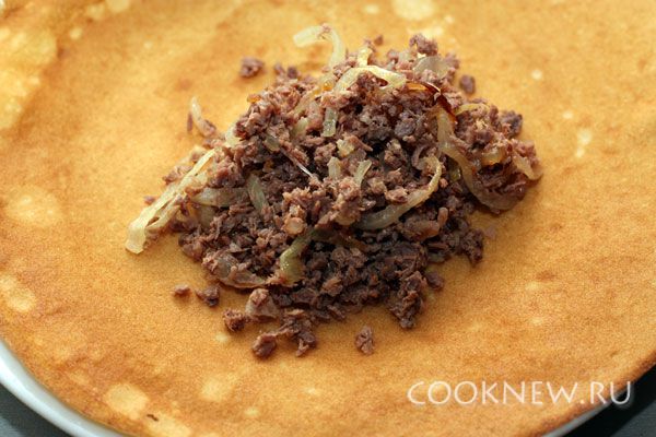 На каждый блин кладите столовую ложку начинки (или чуть больше, в зависимости от размера блинчика) и сворачивайте конвертиком