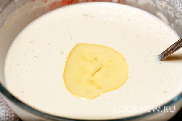 В заключение влейте в тесто немного растительного масла. Это поможет не добавлять масло при жарке и даст возможность легко сниматься блинчикам